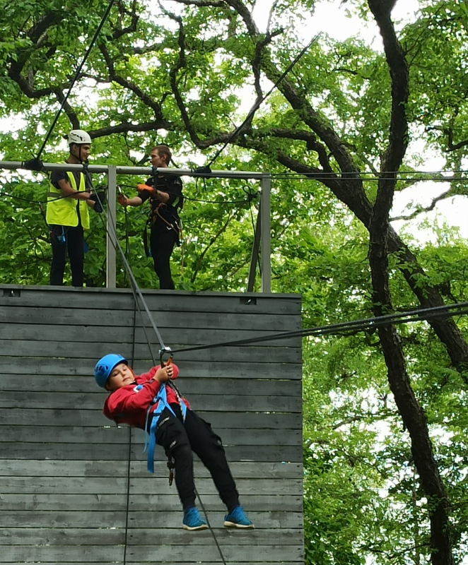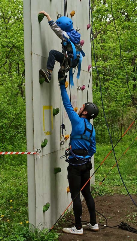 препятствий по бревну и параллельным веревкам, подняться по скалодрому,