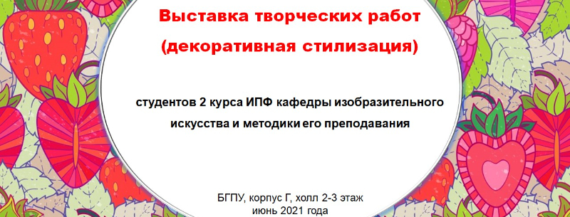15 июня 2021 года на ИПФ отрылась выставка творческих работ студентов 2 курса кафедры изобразительного искусства и методики его преподавания под руководством преподавателя кафедры Копорушко Н.А. На выставке представлены работы, выполненные в направлении декоративной стилизации в цвете и графике. Выставка проходит в холле 2 и 3 этажа.