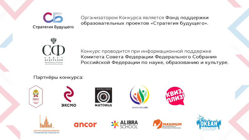 Организатором Конкурса является Фонд "Стратегия будущего" при информационной поддержке Комитета Совета Федерации Федерального Собрания Российской Федерации по науке, образованию и культуре.