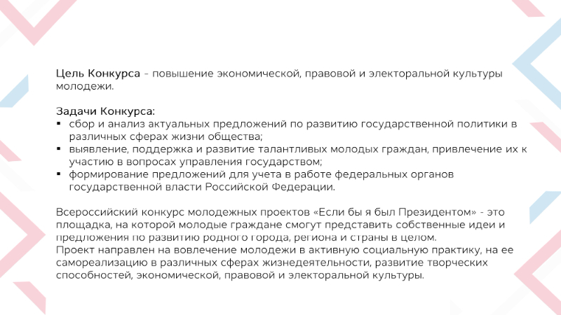 Если бы я был Президентом - это площадка, объединяющая молодых людей, готовых предлагать и реализовывать идеи для развития и процветания нашей великой страны! Конкурс проводится с целью повышения экономической, правовой и электоральной культуры молодежи, выявления, поддержки и развития талантливых молодых граждан, привлечения их к участию в вопросах управления государством.