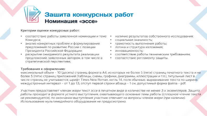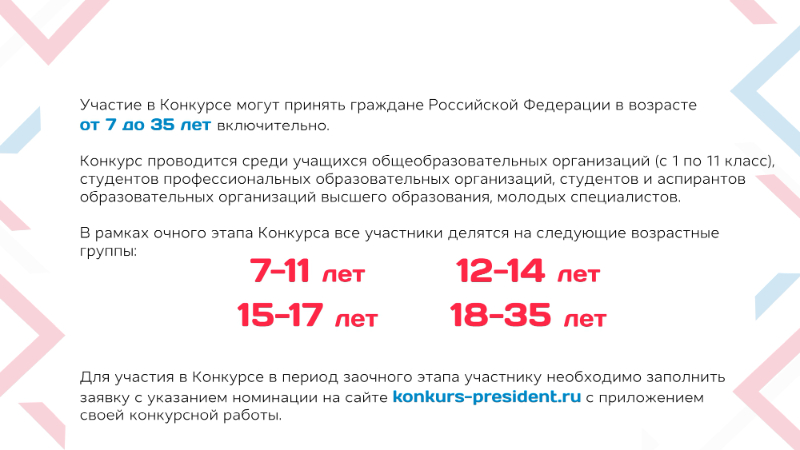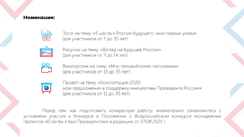 - Эссе на тему: «5 шагов к России будущего: мои первые указы» (для участников от 7 до 35 лет);