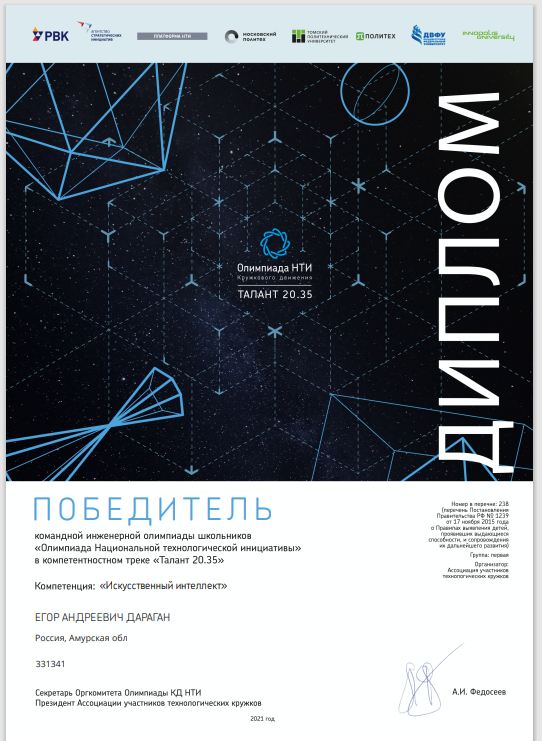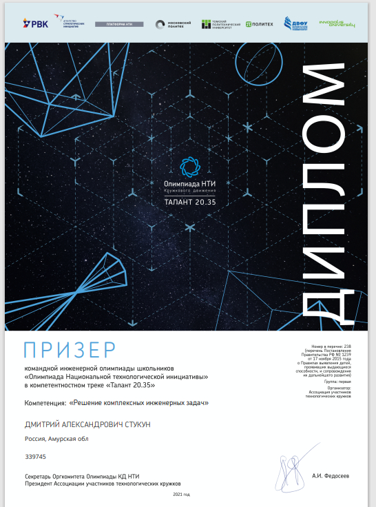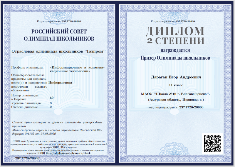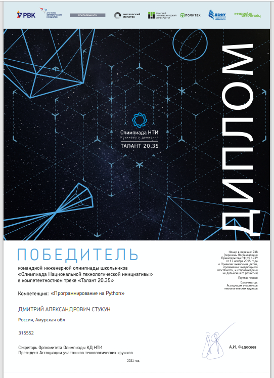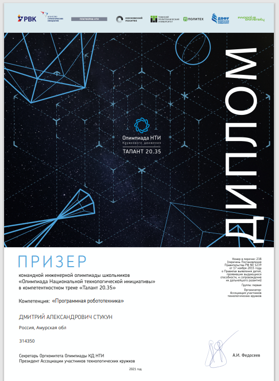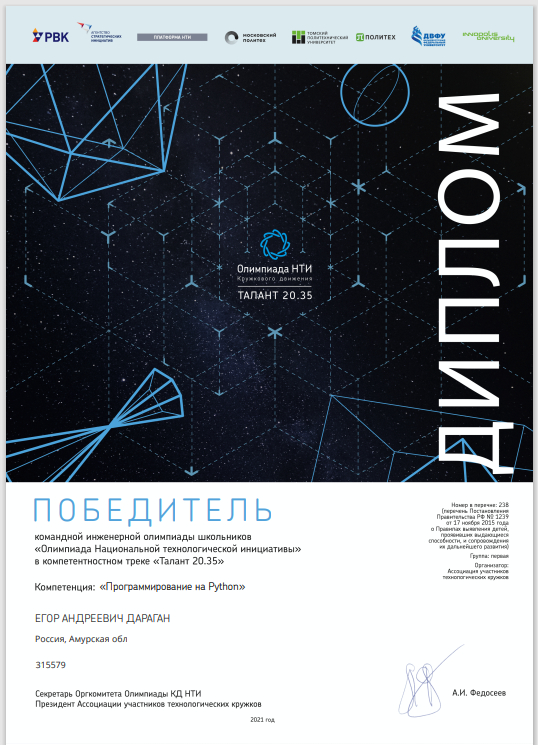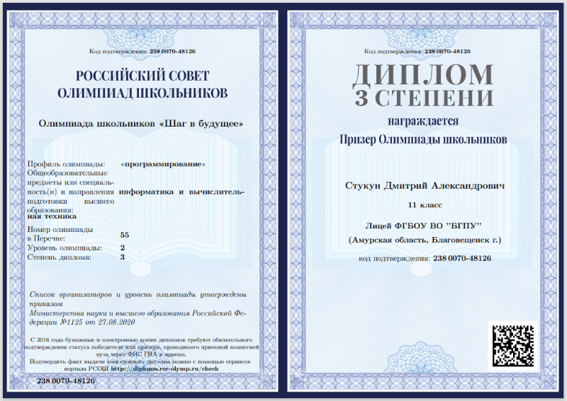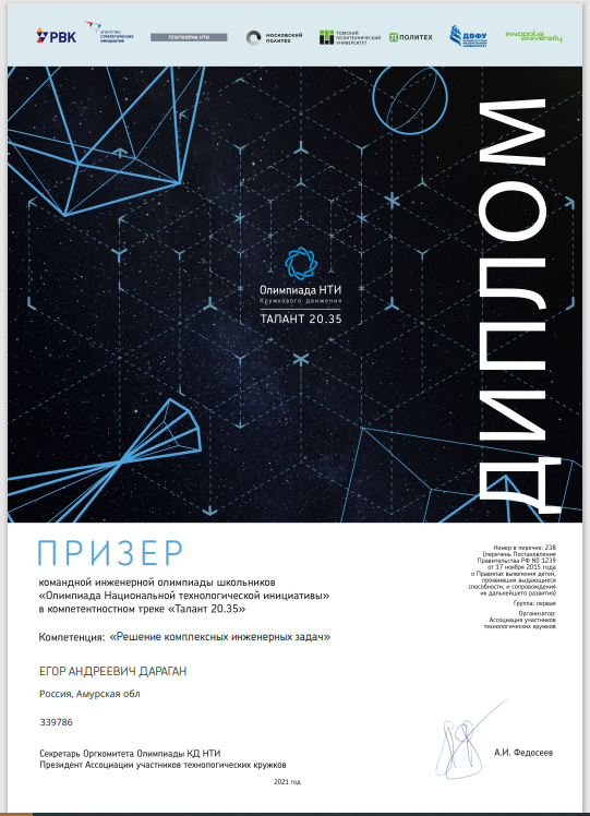 Мечта любого выпускника школы – поступление в вуз без вступительных испытаний (БВИ). Очередной раз выпускники Детского научно-образовательного центра БГПУ реализовали свою мечту летом этого года. Ребята несколько лет упорно шли к этой цели. Они участники многих олимпиад, неоднократные победители и призеры городских и региональных этапов Всероссийской олимпиады школьников по различным предметам (информатика, математика, физика, технология, обществознание). И вполне логичный результат в олимпиадном сезоне 2020-21: дипломы призёров олимпиад, включенных в список Российского совета олимпиад школьников. Стукун Дмитрий, выпускник Лицея БГПУ стал призёром олимпиады «Шаг в будущее» по профилю «Программирование»; Дараган Егор, выпускник МАОУ «Школа № 16» стал призёром олимпиады «Газпром» по профилю «Информационные и коммуникационные технологии». Ребята стали также многократными победителями и призёрами Всероссийского конкурса «Талант 20.35». Успешно подтвердив уровень своих знаний высокими результатами ЕГЭ по информатике в 93 и 90 баллов, Дима и Егор получили возможность свободно выбирать вуз и направление подготовки, ведь теперь их суммарный балл для поступления во многие университеты стал равным 310 баллам. И они сделали свой выбор: сегодня Егор Дараган – студент Института компьютерных наук и технологий федерального государственного автономного образовательного учреждения высшего образования «Санкт-Петербургский политехнический университет Петра Великого» по направлению подготовки 02.03.01 Математика и компьютерные науки; Дмитрий Стукун – студент факультета Программной инженерии и компьютерной техники мегафакультета компьютерных технологий и управления федерального государственного автономного образовательного учреждения высшего образования «Национальный исследовательский университет ИТМО» по направлению подготовки 09.03.01 Информатика и вычислительная техника.