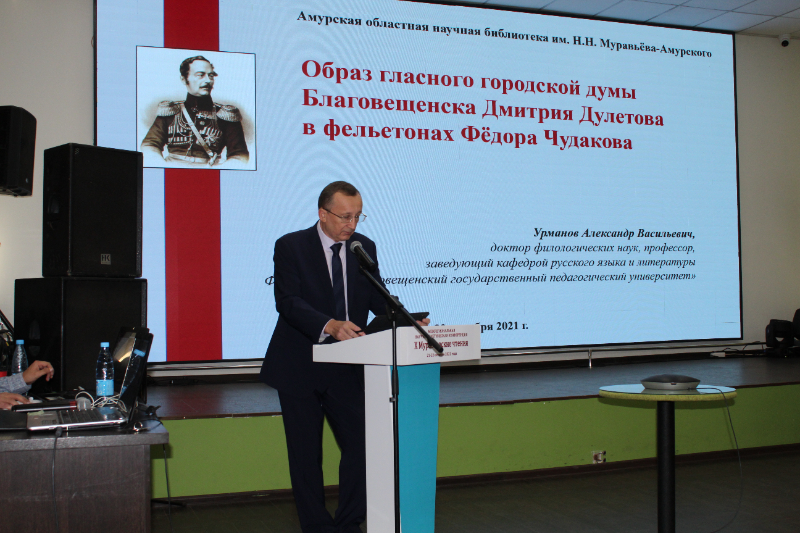 А.В. Урманов свое выступление посвятил образу гласного городской думы Благовещенска Дмитрия Дулетова в фельетонах Фёдора Чудакова.