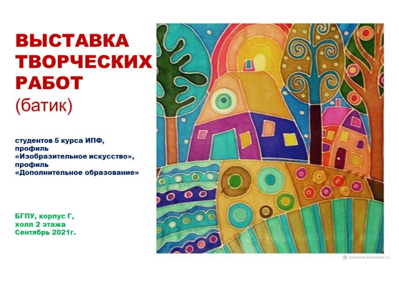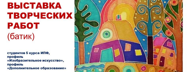 На индустриально-педагогическом факультете отрылась выставка творческих работ студентов 5 курса профиль «Изобразительное искусство», профиль «Дополнительное образование». На выставке представлены работы в технике горячий батик, холодный батик и смешанный.