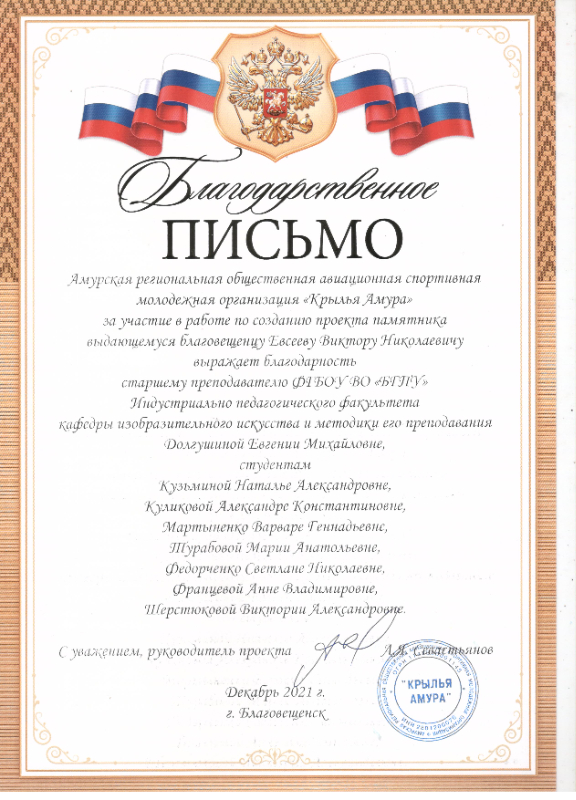 установке в г. Благовещенске памятника для увековечивания подвига Евсеева В.Н. Проект проходит при поддержки