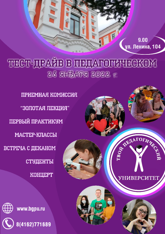 Новостная лентаСделай тест-драйв студенчества в БГПУ!28 января в 9.00 БГПУ приглашает старшеклассников принять участие в деловой игре «Тест-драйв в Педагогическом». По условиям игры школьники проведут один день в уникальном учебном заведении под названием «Твой Педагогический университет». У «тест-драйверов» студенческой жизни есть возможность посетить «Золотую лекцию» и «Первый практикум» и погрузиться в выбранную ими предметную область с ведущими преподавателями БГПУ. Школьники смогут узнать тайны виртуальной магии, приемы логопедической разминки, исследовать свойства минералов, открыть для себя таинственный мир истории и литературы и многое другое. А также посетить творческий мастер-класс, подготовленный студенческими объединениями университета, в неформальной обстановке пообщаться с теми, кто точно знает, как стать успешным студентом. Кульминацией деловой игры станет выступление участников игры на сцене с творческой презентацией своего факультета. Для участия в деловой игре необходимо направить коллективную или индивидуальную заявку до 24 января. Для коллективной заявки необходимо заполнить информацию из поло-жения о конкурсе (Приложение 3) и отправить на почту ovrbgpu@gmail.com. А для индивидуальной заявки нужно отправить информацию в google-форме: ссылка Дополнительная информация по телефону 8 (4162) 99-16-06 Отдел по внеучебной работе БГПУ (Марина Васильевна Воронина – начальник отдела) или 8 (4162) 99-16-45 (Есикова Ольга Сергеевна – координатор деловой игры).