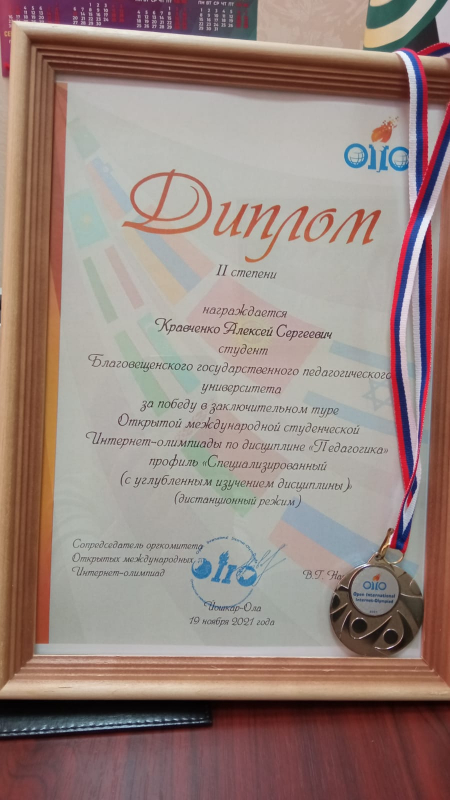 Кравченко Алексей Сергеевич (факультет иностранных языков, группа 303а/к, направление подготовки 44.03.05 Педагогическое образование (с двумя профилями подготовки) (уровень бакалавриата), профиль «Английский язык», профиль «Китайский язык») стал обладателем серебряной медали по педагогике и занял 1 место по ДВФО!