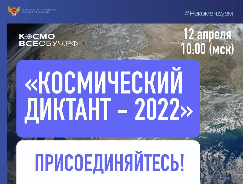 Новостная лента"Космический диктант"Присоединяйтесь к ежегодной акции «Космический диктант»! Диктант пройдёт в очном и дистанционном формате. Диктант проведут: • лётчики-космонавты, • Герои России, • представители Госдумы РФ и Московской городской Думы, • представители Госкорпорации «Роскосмос». ❗️Один из вопросов прозвучит прямо с орбиты Земли! Его зададут члены экипажа Международной космической станции. 📍Дата: 12 апреля 📍Время: 10:00 (мск) 📍Трансляция ссылка 🚀 Поехали! Учите, учитесь, берегите себя и близких!