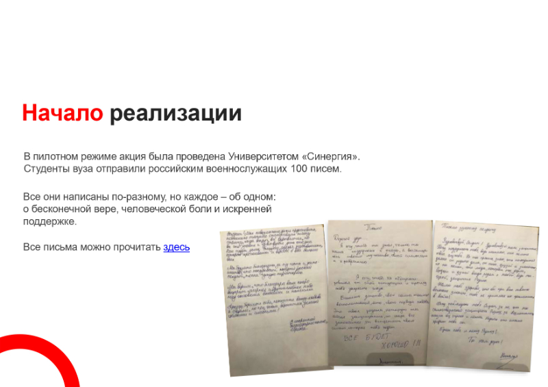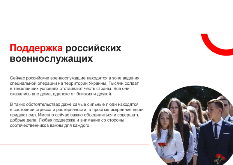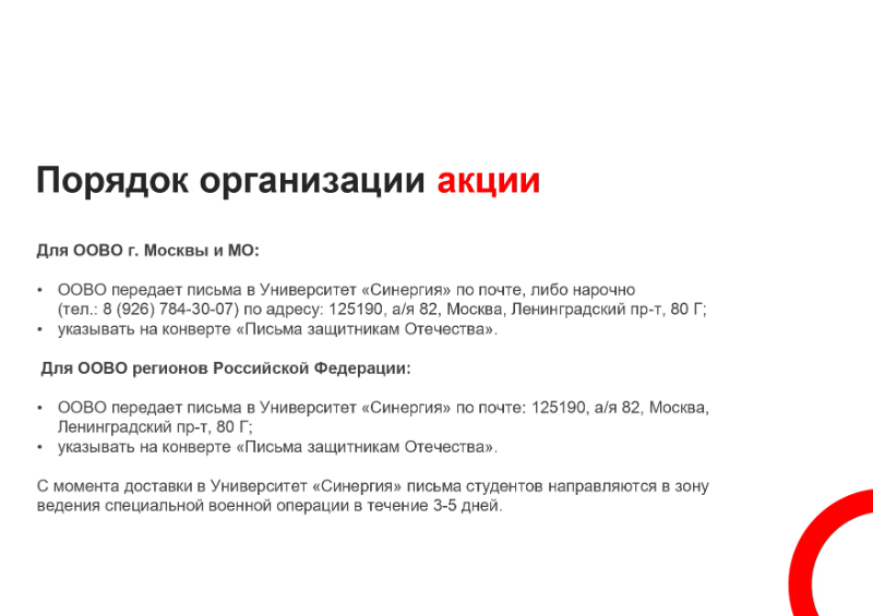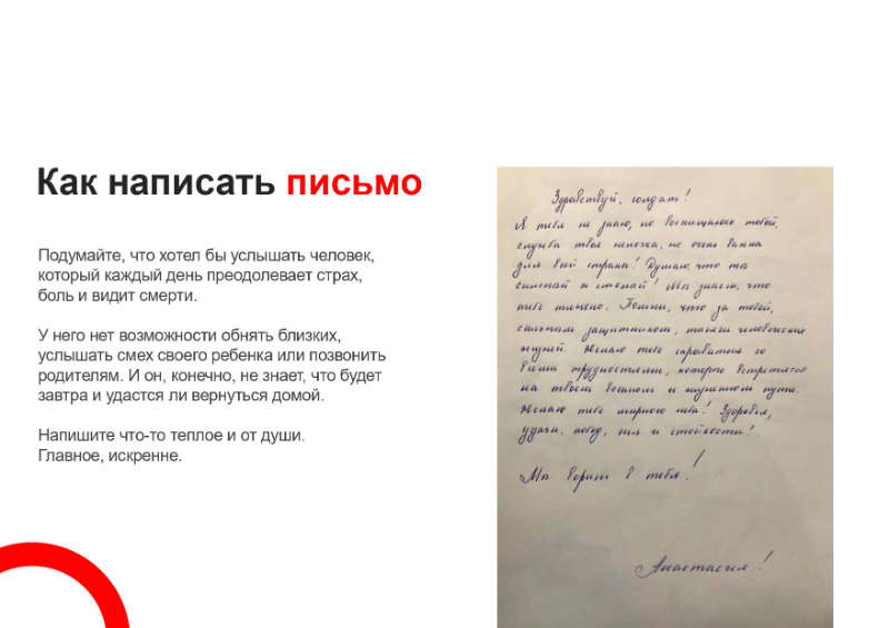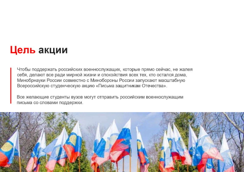 С целью поддержки российских военнослужащих, находящихся в зоне проведения специальной военной операции, есть возможность поучаствовать в акции и отправить письмо военнослужащим, находящимся на территории Луганской и Донецкой Народных Республик и Украины. Планируется, что будет организован централизованный сбор и последующая доставка писем в зону проведения специальной военной операции.