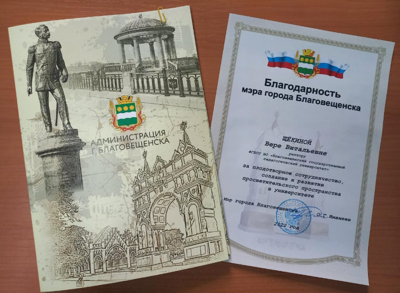 Сегодня, в рамках координационного совета, который проходит на базе БГПУ, Хопатько Виктория Андреевна, от лица мэра г. Благовещенска Имамеева Олега Гатаулловича, наградила ректора БГПУ Веру Витальевну Щёкину за плодотворное сотрудничество, создание и развитие просветительского пространства в университете.