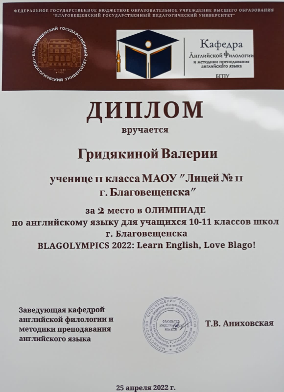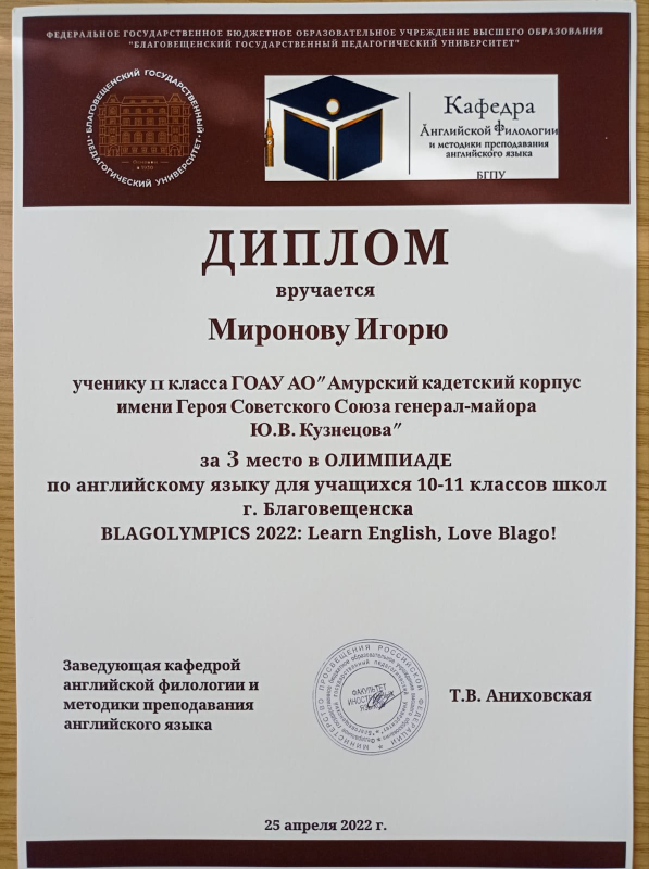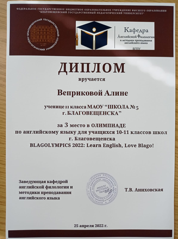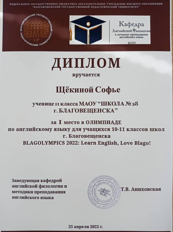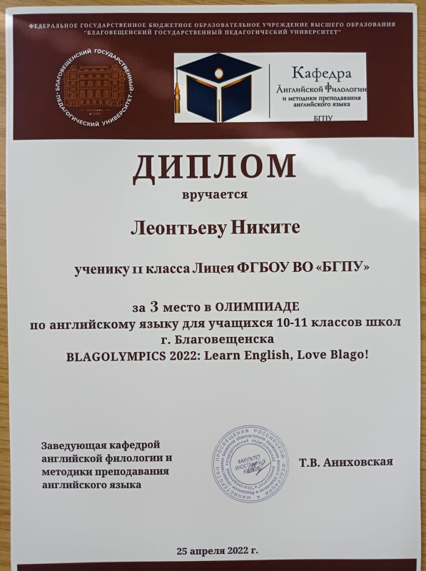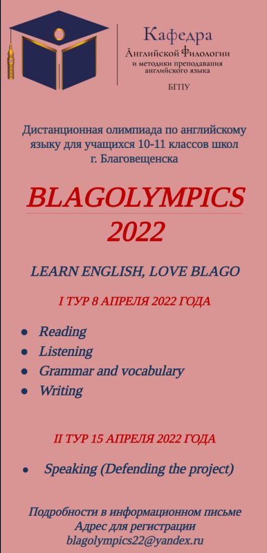 Новостная лентаBlagolympics-2022: любим Благовещенск и английский язык25 апреля подведены итоги олимпиады по английскому языку для учащихся 10-11 классов школ г. Благовещенска «BLАGOLYMPICS 2022: Learn English, Love Blago!», организованной кафедрой английской филологии и методики преподавания английского языка БГПУ. Цель олимпиады - развитие и поддержка интереса школьников к изучению английского языка, а также популяризация знаний об истории, природе и культуре г. Благовещенска и Амурской области среди молодежи. В первом туре, который состоялся 8 апреля 2022 года, приняли участие ребята из гимназий и школ города, лицея БГПУ, Амурского кадетского корпуса, учащиеся ЦОДО БГПУ. Участники, набравшие наибольшее количество баллов, продолжили соревнование во втором туре 15 апреля, где представили свои творческие видеопроекты по теме «Имя для школы» на английском языке. По результатам двух туров победителем стала Щёкина Софья, ученица 11 класса школы №28 (диплом за I место). Гридякина Валерия, ученица 11 класса Лицея № 11, заняла второе место. Диплом за третье место разделили Миронов Игорь, ученик 11 класса Амурского кадетского корпуса имени Героя Советского Союза генерала-майора Ю.В. Кузнецова, Леонтьев Никита, ученик 11 класса Лицея БГПУ, и Веприкова Алина, ученица 11 класса школы № 5. Поздравляем ребят и их учителей с победой и приглашаем в новом учебном году присоединиться к дружной команде студентов факультета иностранных языков БГПУ! Лучшие видеопроекты победителей можно посмотреть по ссылке ссылка