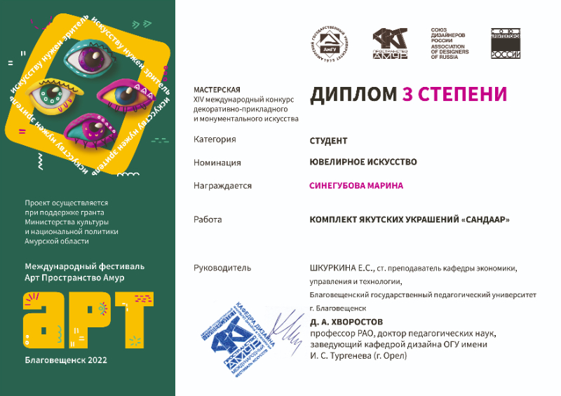 же категории в номинации "Ювелирное искусство" дипломом III степени награждена Синегубова