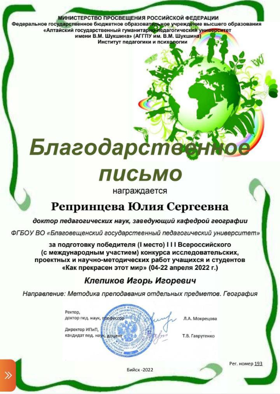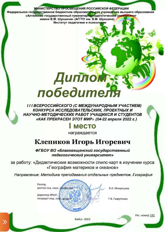На конкурс была представлена курсовая работа студента 4 курса профиль «Биология», профиль «География» Клепикова Игоря Игоревича на тему «Дидактические возможности спилс-карт в изучении курса «География материков и океанов» по направлению: «Методика преподавания отдельных предметов. География». Руководитель работы – Репринцева Юлия Сергеевна, д.пед.н., зав. кафедрой географии. Курсовая работа была отмечена дипломом I степени.