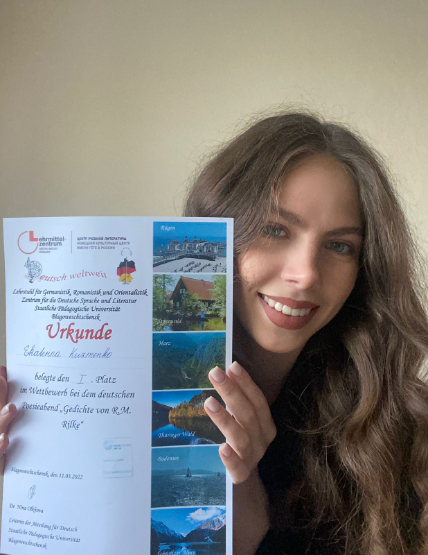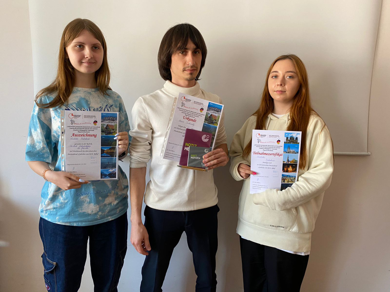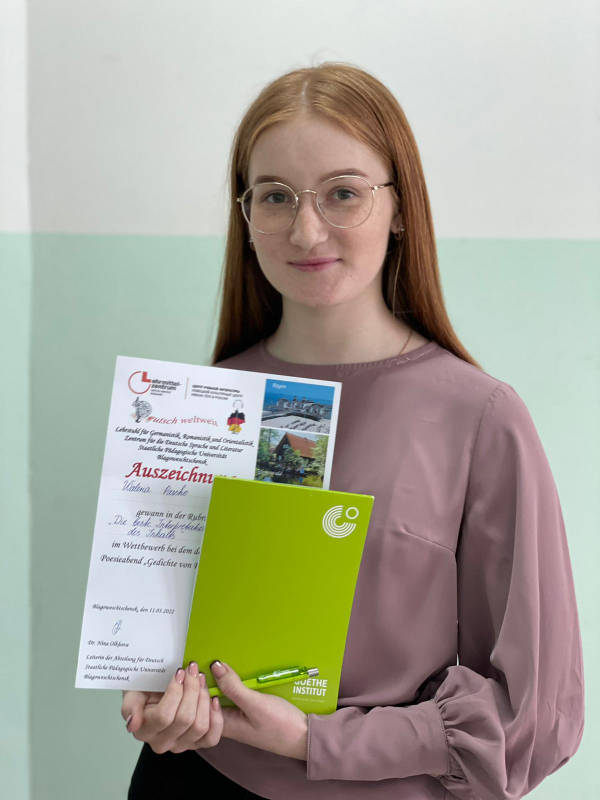 Итоги декламационного конкурса на немецком языке На факультете иностранных языков состоялся декламационный поэтический конкурс на немецком языке. Конкурс был посвящён творчеству Райнера Марии Рильке, одного из самых влиятельных австрийских поэтов-модернистов XX века. Рильке интенсивно занимался русской литературой и искусством, переводами с русского, встречался с Л. Толстым, И. Репиным и Л. Пастернаком, вёл переписку с М. Цветаевой, которая посвятила его памяти поэму и очерк. В поэтическом конкурсе традиционно приняли участие студенты-германисты 1-3 курсов. Критерии оценки конкурсного задания включали: Жюри, в состав которого вошли выпускники-германисты факультета, школьные учителя и преподаватели немецкого языка, присудило следующие места и номинации: Гран-при – Вячеслав Заруба (301 «а/н») 1 место – Александр Поздняков (101 «а/н»), Екатерина Кузьменко (301 «а/н») 2 место – Елизавета Гузь (101 «а/н») 3 место – Максим Друковский (201 «а/н») Номинация «Лучшая интерпретация содержания» – Валерия Пасько (101 «а/н») Номинация «Лучшая презентация стихотворения» – Виолетта Балакина (201 «а/н») Номинация «Лучшее произношение» – Диана Ларионова (101 «а/н») Номинация «Дебют» – Диана Иванова (101 «а/н») Номинация «Создание художественного образа» – Дарья Скрипник (201 «а/н») Спецприз жюри – Дмитрий Медведев (301 «а/н») Особые слова благодарности оргкомитет адресует студенткам 4 курса Анжелике Юшкевич и Элеоноре Кузнецовой – постоянным участницам декламационных конкурсов. Благодарим всех организаторов, членов жюри и конкурсантов и искренне поздравляем победителей и призеров!