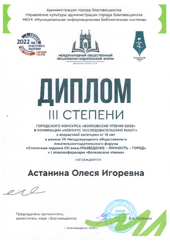 очерках Ф.И. Чудакова “В починке”»); III степени