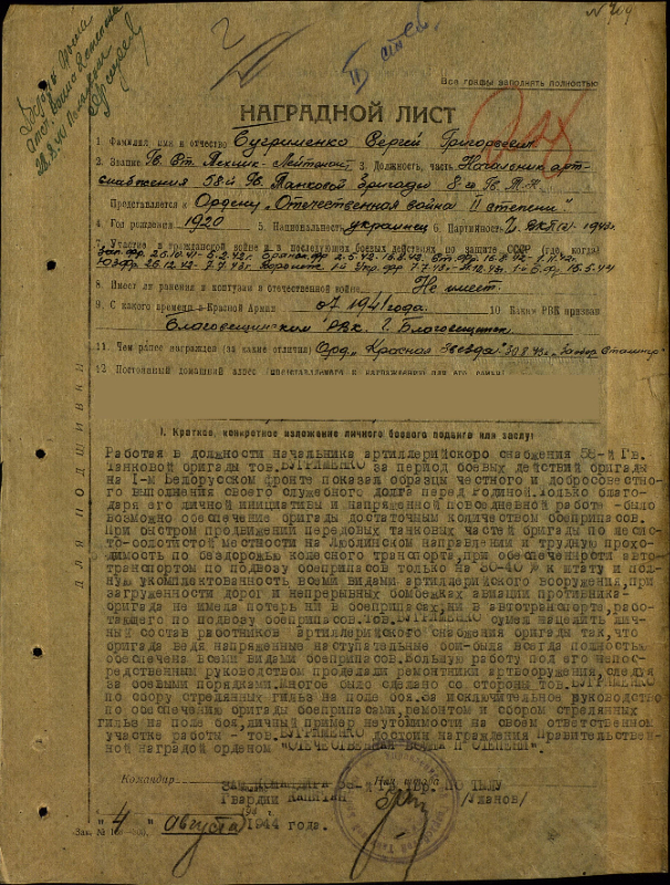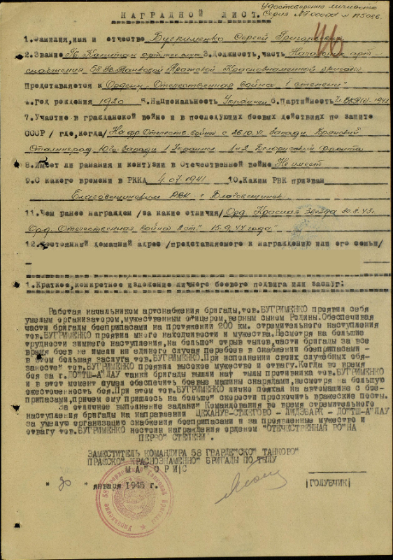 Новостная лентаИз стен института в ряды РККА...БУГРИМЕНКО СЕРГЕЙ ГРИГОРЬЕВИЧ Родился 3 октября 1920 года в УССР Сумская область, Глинский район, село Новая Требя. В 1928 году родители по плановому переселению отправились в ДВК. В 1936 году окончил Роменскую НСШ Советского района Хабаровского края. В 1937 году окончил педагогический рабфак при Благовещенском государственном педагогическим институте. 1937-1941 гг. - учился на физико-математическом факультете. Окончил институт с красным дипломом, получив профессию учителя математики. В июне 1941 года из стен института был призван в ряды РККА и послан учиться в Артиллерийскую Академию им. Дзержинского в г. Москва. В Академии проучился до октября 1941 года, по итогу обучения было присвоено офицерское звание. Сразу после Академии был отправлен в действующую армию. Последнее время служил на должностях начальника артиллерийского снабжения танковой бригады. С октября 1941 года по май 1945 года был на фронтах Отечественной войны: Западном, Брянском, Сталинградском, Юго-Западном, 1-ом Украинском, 1-ом Белорусском. В мае 1945 года демобилизован из рядов РККА в звании капитана Советской Армии. После войны вернулся на работу в БГПИ. 1946-1949 гг. — ассистент кафедры математики. 1949-1951 гг. — ст. преподаватель кафедры математики. 1951-1955 гг. — заместитель директора БГПИ по заочному отделению. В 1956 году сдал кандидатский минимум в МГУ им. Ломоносова. В 1957 году стал заведующим кафедрой математики на физико-математическом факультете. 1960-1983 — декан физико-математического факультета. В 1964 году стал и.о. доцента кафедры математического анализа. В 1970 году освобожден от и.о. доцента и переведен на должность старшего преподавателя. С 1971 года — доцент кафедры элементарной математики и методики математики. В 1983 году ушел с должности декана по собственному желанию. 1985-1989 гг. — заведующий кафедрой математического анализа. В 1989 году ушел на пенсию. НАГРАДЫ: ордена: Отечественной войны I и II степени, Красной Звезды; медали: «За оборону Москвы», «За оборону Сталинграда», «За взятие Кенигсберга», «За победу над Германией в Великой Отечественной войне 1941-1945 гг.». Видео посвященное Сергею Григорьевичу можно посмотреть по ссылке