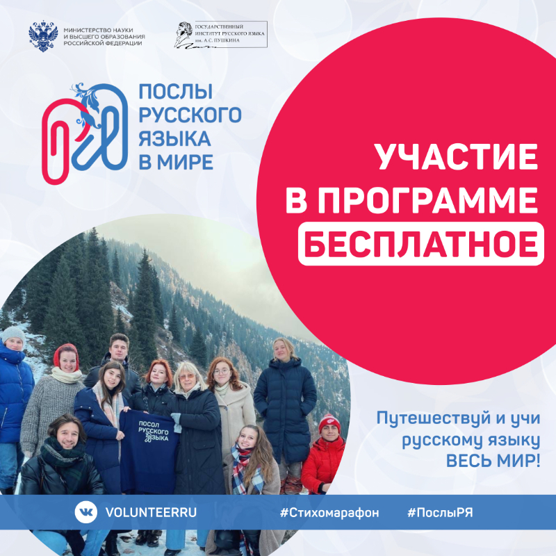 Участие в программе бесплатное: организаторы обеспечивают послам русского языка трансферы в зарубежные страны, проживание, питание, методические материалы, сувенирную продукцию и брендированную одежду для проведения занятий.