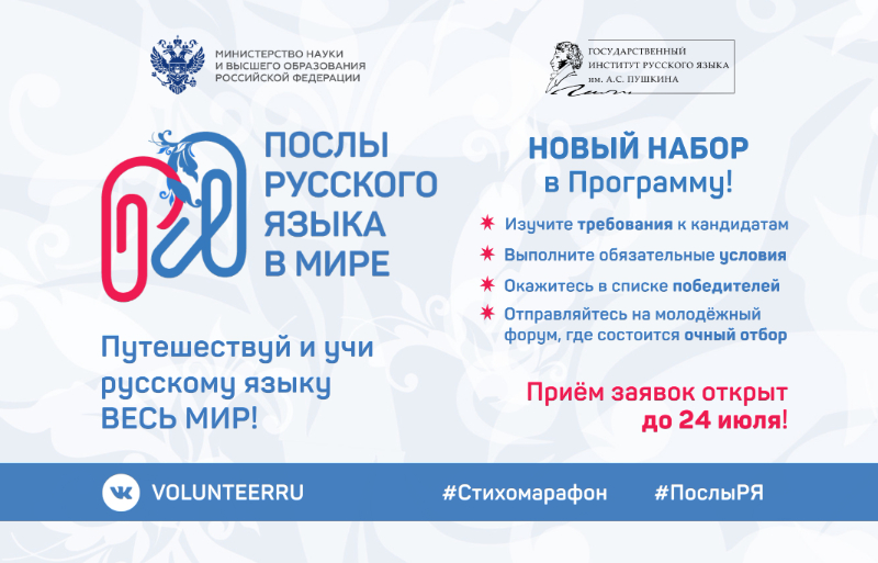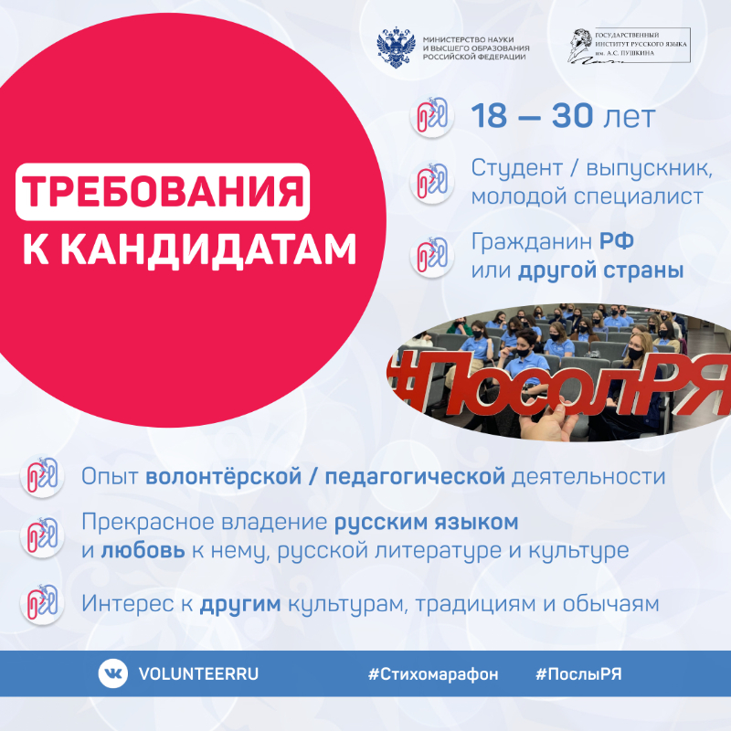 Для участия в конкурсном отборе приглашаются студенты, аспиранты и молодые специалисты в возрасте от 18 до 30 лет с опытом волонтёрской или педагогической деятельности, которые знают и любят русский язык и культуру, хотят развиваться в сфере межкультурной коммуникации и международных