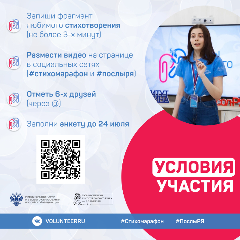− записать фрагмент любимого стихотворения на видео и разместить его на своей странице в социальной сети с хештэгами #стихомарафон и #послыря и передать эстафету шестерым друзьям;