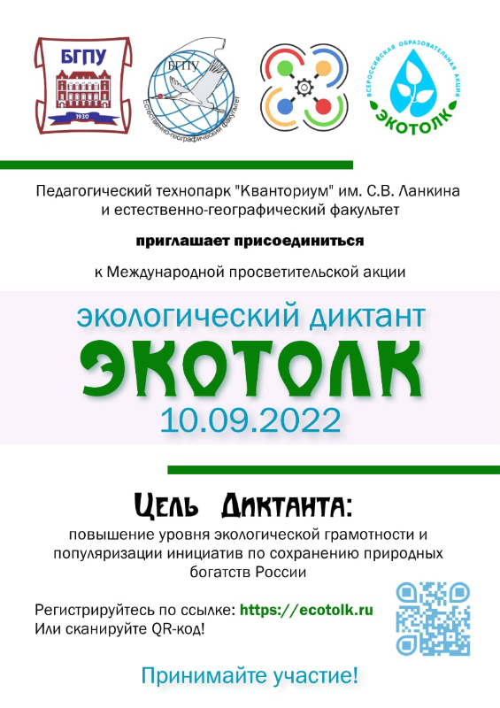 Новостная лентаПрисоединяемся к Международной просветительской акции «Экологический диктант «ЭкоТолк»Педагогический технопарк «Кванториум» им. С.В. Ланкина и Естественно-географический факультет приглашает вас 10.09.2022 присоединиться к Международной просветительской акции «Экологический диктант «ЭкоТолк»! Целью Диктанта является повышение уровня экологической грамотности и популяризации инициатив по сохранению природных богатств России. Проходите регистрацию на сайте и принимайте участие!