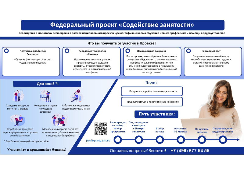 Новостная лентаИспользуйте все возможности для карьерного роста!В рамках сотрудничества с федеральным проектом «Содействие занятости» есть возможность бесплатно повысить квалификацию или пройти профессиональную переподготовку. Что вы получите от участия в Проекте? ● Получение профессии без затрат Обучение финансируется за счет Федерального проекта «Содействие занятости» в рамках Национального проекта «Демография». ● Передовые технологии обучения Практические занятия в рамках Проекта проводят ведущие эксперты, а теоретическая часть реализуется на образовательной платформе. ● Официальный документ После прохождения обучения Вы получаете официальный документ о дополнительном профессиональном образовании или обучении: удостоверение о повышении квалификации, диплом о профессиональной переподготовке. ● Карьерный рост Получение новых знаний всегда способствует улучшению трудовых условий либо горизонтальному развитию в компании. Принять участие в проекте могут следующие категории: - Молодежь в возрасте до 35 лет включительно, относящаяся к категориям: - Граждан, которые с даты окончания военной службы по призыву не являются занятыми в соответствии с законодательством о занятости населения в течение 4 месяцев и более; - Граждан, которые с даты выдачи им документа об образовании (квалификации) не являются занятыми в соответствии с законодательством о занятости населения в течение 4 месяцев и более; - Граждан, завершающих обучение по образовательным программам среднего профессионального или высшего образования в текущем календарном году, обратившихся в органы службы занятости, для которых отсутствует подходящая работа по полученной профессии (специальности); Участвуйте и приглашайте к участию близких! Как стать участником проекта? 1 шаг. Выбор программы на странице для партнеров Содействие занятости (profiprogram.ru) 2 шаг. Подача заявки. Заполнение анкеты. После корректной регистрации на почту придет письмо с инструкцией и вам перезвонит представитель колл-центра. 3 шаг. Подтверждение категории участника в Центре занятости населения. После заполнения анкеты в течение 1-2 дней на почту придет письмо со ссылкой на форму загрузки необходимых документов по выбранной категории участника. 4 шаг. Обратная связь от менеджера. После подтверждения категории в течение 1-7 дней связывается менеджер для уточнения вопросов. 5 шаг. Подтверждение личности и образования. Затем необходимо загрузить документы для зачисления на программу: диплом об образовании, российский паспорт, документ,