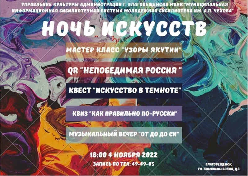 Муниципальная молодежная библиотека имени А.П. Чехова, расположенная по адресу: ул. Комсомольская, д. 3, 4 ноября в 18:00 проводит всероссийскую акцию «Ночь искусств».