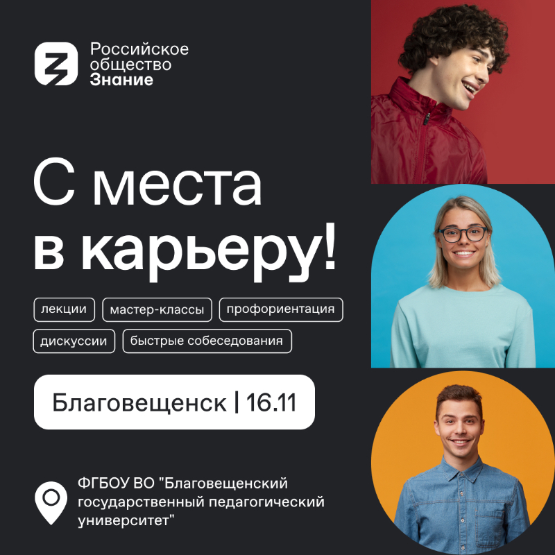 16 ноября на площадке БГПУ (ул. Ленина, д. 104) состоится молодежный форум «С места в карьеру», организованный Российским обществом «Знание». Лекции, мастер-классы, а также презентации программ стажировок в крупнейших региональных компаниях и первые собеседования состоятся на форуме. Мероприятие проходит бесплатно, для участия необходимо зарегистрироваться на сайте