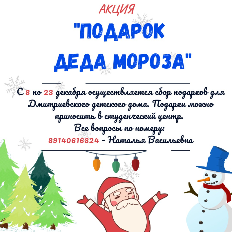 Новостная лентаАкция "Подарок Деда Мороза"Новый год – самый сказочный и атмосферный праздник. День – когда чудо витает в воздухе. Чудеса и исполнение самой заветной мечты необходимо всем, но в первую очередь – детям. Каждый ребенок мечтает найти под ёлкой то, о чем мечтал весь год и всей душой поверить в Новогоднее чудо. И еще сильнее об этом мечтают дети, оставшиеся без попечения родителей, дети, которым поверить в чудо не так просто. В рамках акции «Подарок Деда Мороза» у каждого человека есть возможность стать тем самым волшебником, который заставит глаза этих детей искриться от счастья. Для детей «Дмитриевского Детского дома» мы объявляем сбор подарков, которые им необходимы: - спортивный инвентарь (мячи футбольные, теннисные ракетки и мячи); - наборы для рукоделия (алмазные мозаики, гравюры); - сладкие подарки; - канцелярия; - и все, что вы сами захотите подарить деткам! Подарки принимаются в Студенческом Центре БГПУ до 23 декабря. Давайте поможем поверить в чудо детям ВМЕСТЕ