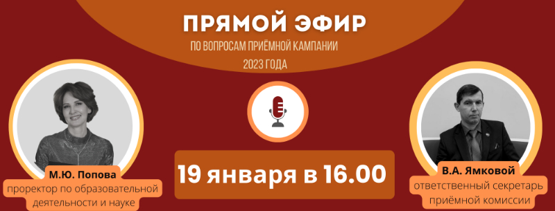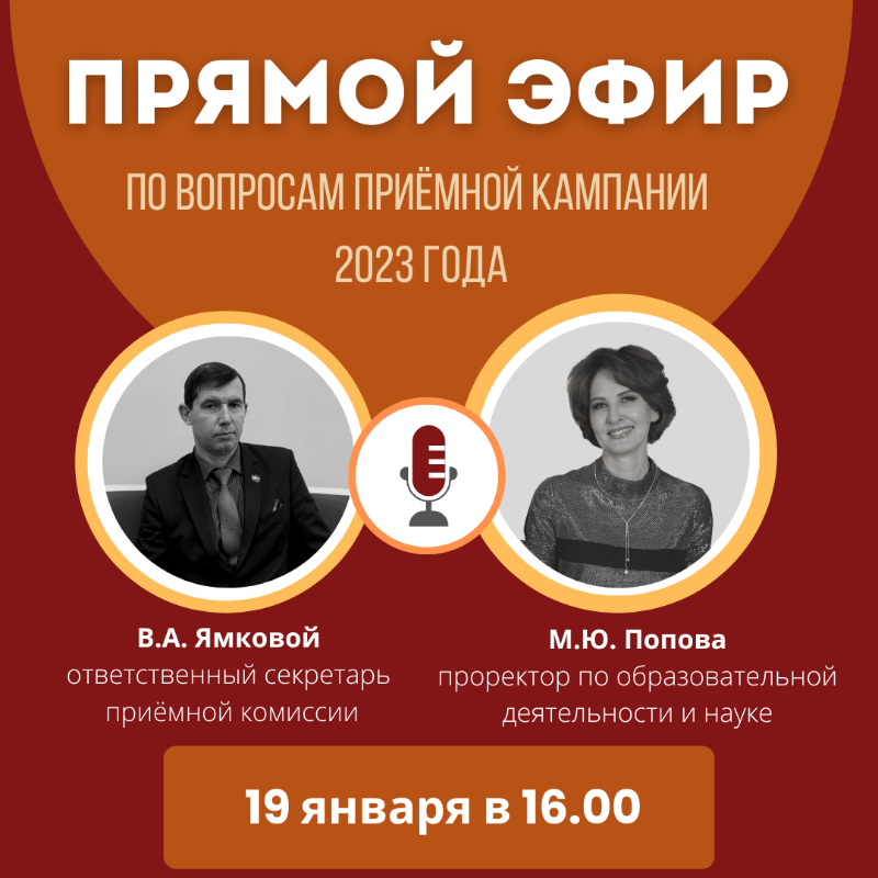 19 января 2023 года в 16:00 ФГБОУ ВО БГПУ проведет прямой эфир в социальной сети ВКонтакте по вопросам приемной кампании 2023 года с участием проректора по образовательной деятельности и науке Поповой М.Ю. и ответственного секретаря приемной комиссии Ямковым В.А.