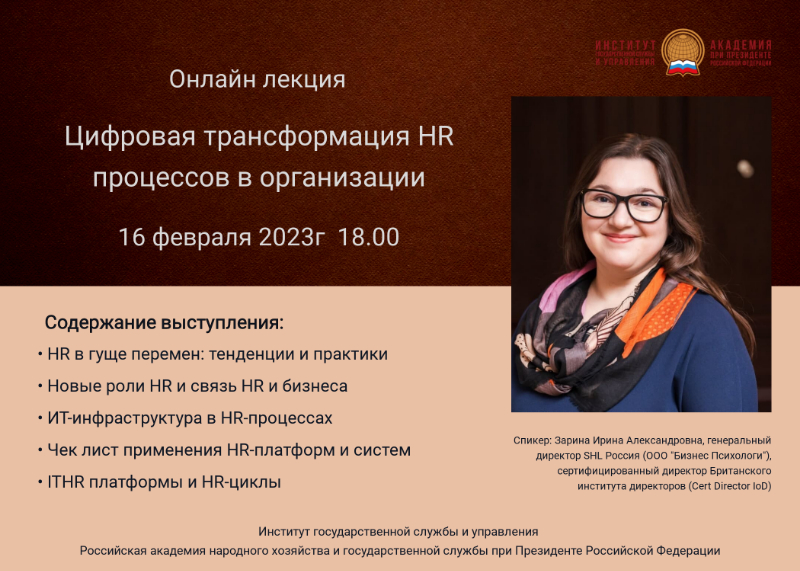 Приглашаем Вас на онлайн-лекцию «Цифровая трансформация HR процессов в организации», которая состоится 16 февраля 2023г с 18:00 по 19:00 дистанционно