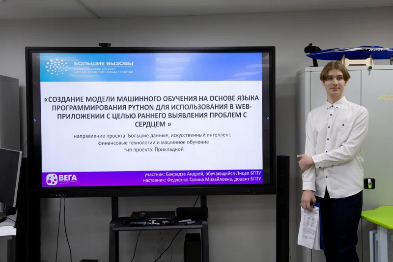 2 место – Бакрадзе Андрей (ДНОЦ БГПУ, Педагогический лицей БГПУ). Проект «Создание модели машинного обучения на основе языка программирования PYTHON на примере WEB-приложения для распознавания проблем с сердце на ранних стадиях у человека». Направление «Большие данные, искусственный интеллект, финансовые технологии и машинное обучение».