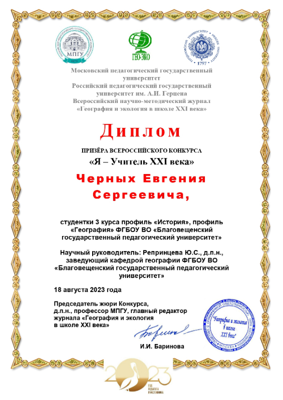В направлении конкурса «Учитель – профессия дальнего действия, главная на Земле» студент 3 курса профиль «История», профиль «География» Черных Евгений Сергеевич подготовил эссе и стал призёром.
