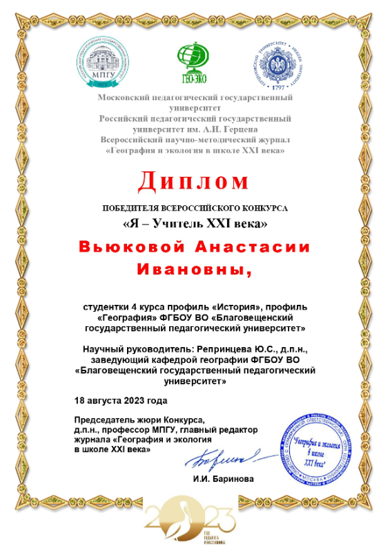 В направлении конкурса «Современные методы и формы организации процесса, обучения и воспитания» студентка 4 курса профиль «История», профиль «География» Вьюкова Анастасия Ивановна стала победителем!