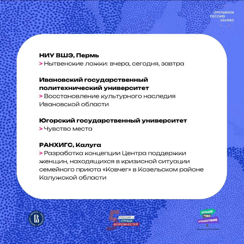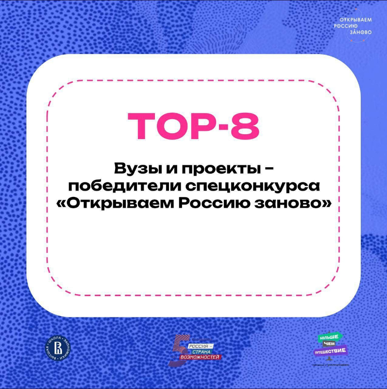 Новостная лентаОпределены победители спецконкурса на проведение экспедиций от «Открываем Россию заново»21 Сентября 2023Определены победители спецконкурса на проведение экспедиций от «Открываем Россию заново» 8 вузов-пилотов отправятся в проектную или исследовательскую экспедицию и решат задачи стратегического развития одного из регионов России.