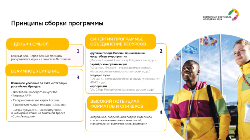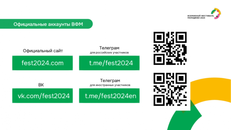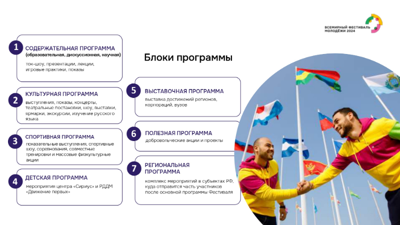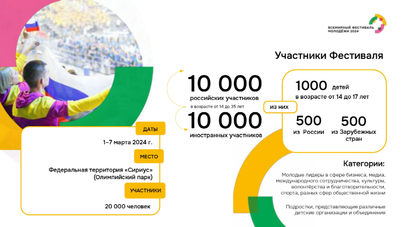 В соответствии с Указом Президента Российской Федерации от 5 апреля 2023 г. № 249 «О проведении Всемирного фестиваля молодежи в 2024 году» с 1 по 7 марта 2024 года в г. Сочи состоится Всемирный фестиваль молодежи.