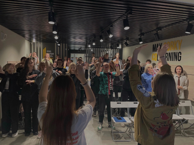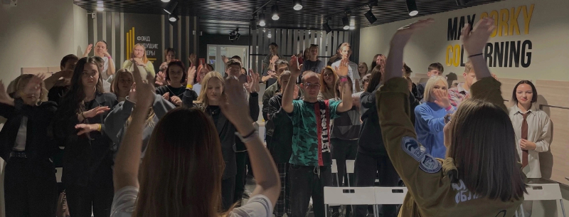 Студенты провели для ребят утреннюю разминку-игру с залом, игры на сплочение, а так же вместе разучили несколько танцев.