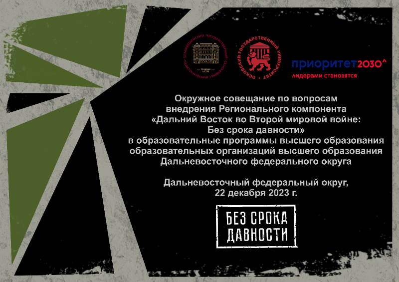 В рамках Окружного совещания будут представлены итоги работы региональных круглых столов по вопросам внедрения регионального компонента образовательного модуля «Великая Отечественная война: без срока давности», которые прошли на базе Дальневосточного федерального университета, Благовещенского государственного педагогического университета, Амурского гуманитарно-педагогического государственного университета и Тихоокеанского государственного университета в ноябре – декабре 2023 г.