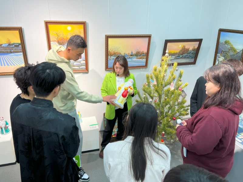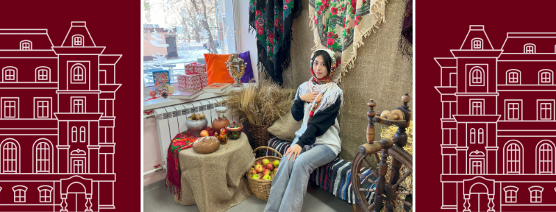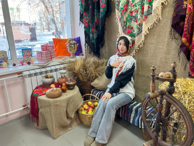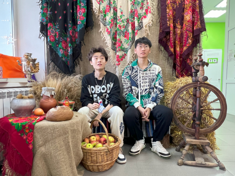 А в завершение студенты фотографировались в яркой фотозоне, подготовленной специально к их визиту. В ней были и традиционные русские платки, и корзины с осенним урожаем, и веретено, и другие предметы русского быта.
