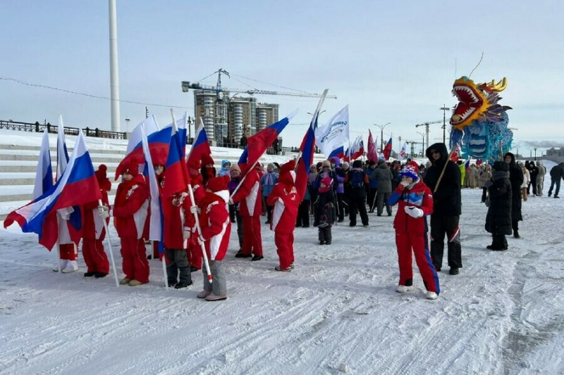 Под патриотические песни и приободряющие кричалки участники фестиваля с флагами и в сопровождении символа года дракона прошли по набережной от амфитеатра до маяка.