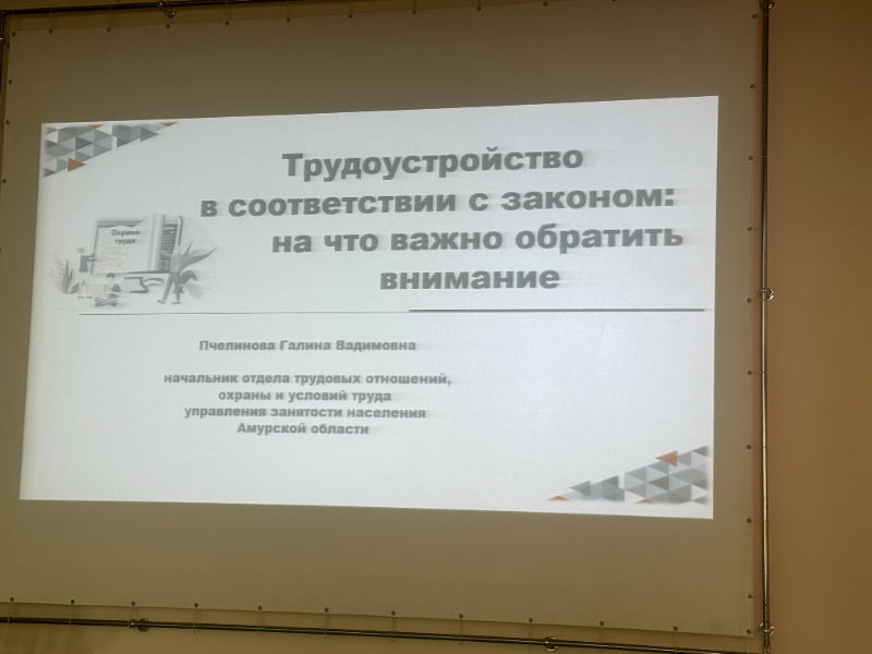 Пчелинова Галина Вадимовна, начальник отдела трудовых отношений, охраны и условий труда Управления занятости населения Амурской области рассказала будущим выпускникам о том, на что важно обратить внимание при заключении трудового договора с работодателем, проинформировала об условиях труда, организация безопасного рабочего места, первичного инструктажа на рабочем месте.