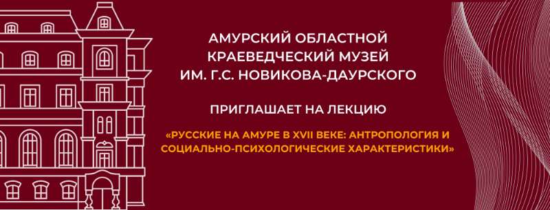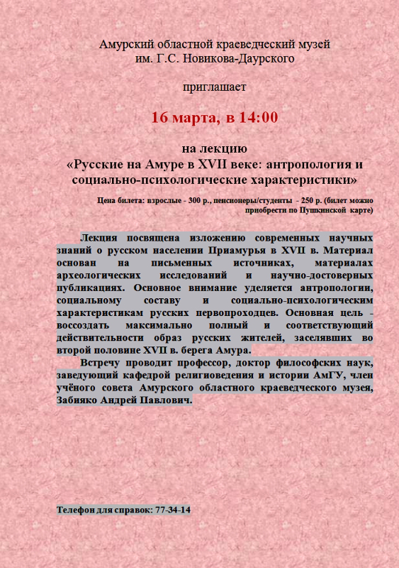 Новостная лентаПриглашаем на лекцию!Амурский областной краеведческий музей им. Г.С. Новикова-Даурского приглашает 16 марта, в 14:00 на лекцию «Русские на Амуре в XVII веке: антропология и социально-психологические характеристики» Цена билета: взрослые - 300 р., пенсионеры/студенты - 250 р. (билет можно приобрести по Пушкинской карте) Лекция посвящена изложению современных научных знаний о русском населении Приамурья в XVII в. Материал основан на письменных источниках, материалах археологических — исследований и — научно-достоверных публикациях. Основное внимание уделяется антропологии, социальному составу и социально-психологическим характеристикам русских первопроходцев. Основная цель - воссоздать максимально полный и соответствующий действительности образ русских жителей, заселявших во второй половине XVII в. берега Амура. Встречу проводит профессор, доктор философских наук, заведующий кафедрой религиоведения и истории АмГУ, член учёного совета Амурского областного краеведческого музея, Забияко Андрей Павлович. Телефон для справок: 77-34-14