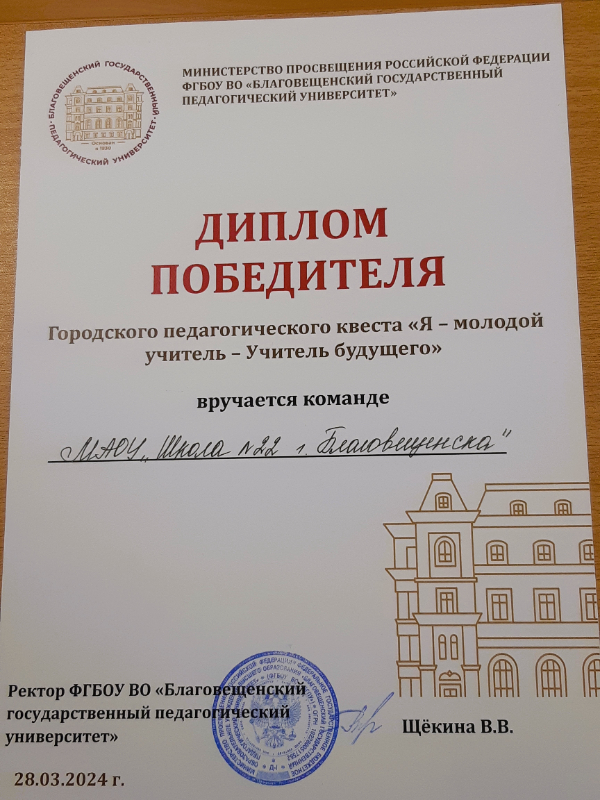 Победителями педагогического квеста стали молодые учителя из МАОУ «Школа № 22 г. Благовещенска». Дипломом II степени отмечены учителя сборной команды из МАОУ «Лицей № 11 г. Благовещенска», МАОУ «Лицей № 6 г. Благовещенска» и «Школа № 5 г. Благовещенска». Дипломом III степени награждены будущие молодые учителя – студенты 4 курса профиль «Английский язык», профиль «Французский язык» БГПУ.