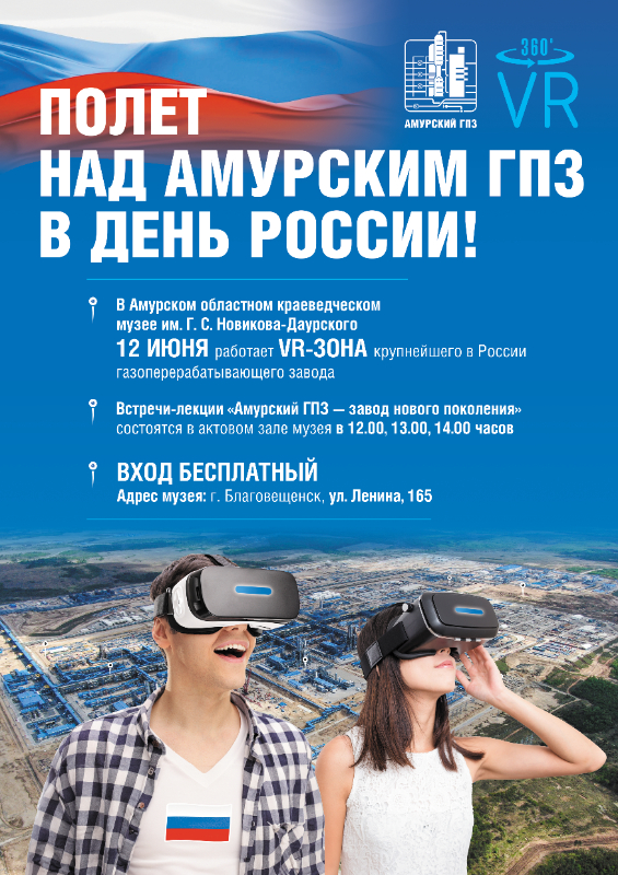 Новостная лентаВ День России можно будет совершить полет над Амурским ГПЗВ День России можно будет совершить полет над Амурским ГПЗ прямо из зала Амурского областного краеведческого музея. Там будет работать VR-зона крупнейшего в России газоперерабатывающего предприятия. Также 12 июня ( в 12.00, 13.00, 14.00) в музее можно узнать много интересного о новом заводе на встрече с сотрудниками «Газпром переработка Благовещенск» (заказчик, инвестор и эксплуатирующая организация Амурского ГПЗ). Вам расскажут, как на Амурском ГПЗ природный газ разделяют на ценные компоненты, для чего они нужны и каким образом один из главных продуктов предприятия – сверхчистый гелий – становится жидким. Для юных посетителей будет работать интерактивная зона, где можно будет поиграть в тематические игры, нарисовать картину с изображением промышленного гиганта и принять участие в викторине, самые активные участники которой получат призы!