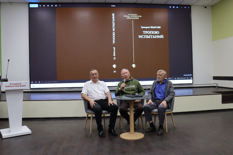 В 13.30 в зале «Амур» профессором А. Урмановым и амурскими писателями В. Лециком и П. Савинкиным была представлена первая из них: Федосеев Г.А. Тропою испытаний. Повесть. Из золотого фонда литературы Приамурья. Книга III / вступ. ст. А.В. Урманова. Благовещенск: Изд-во БГПУ, 2024. 416 с.