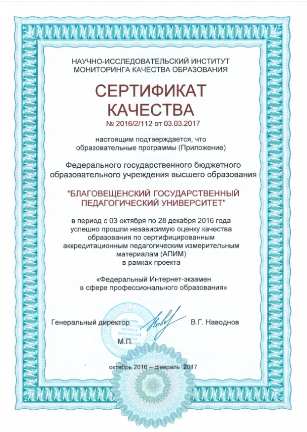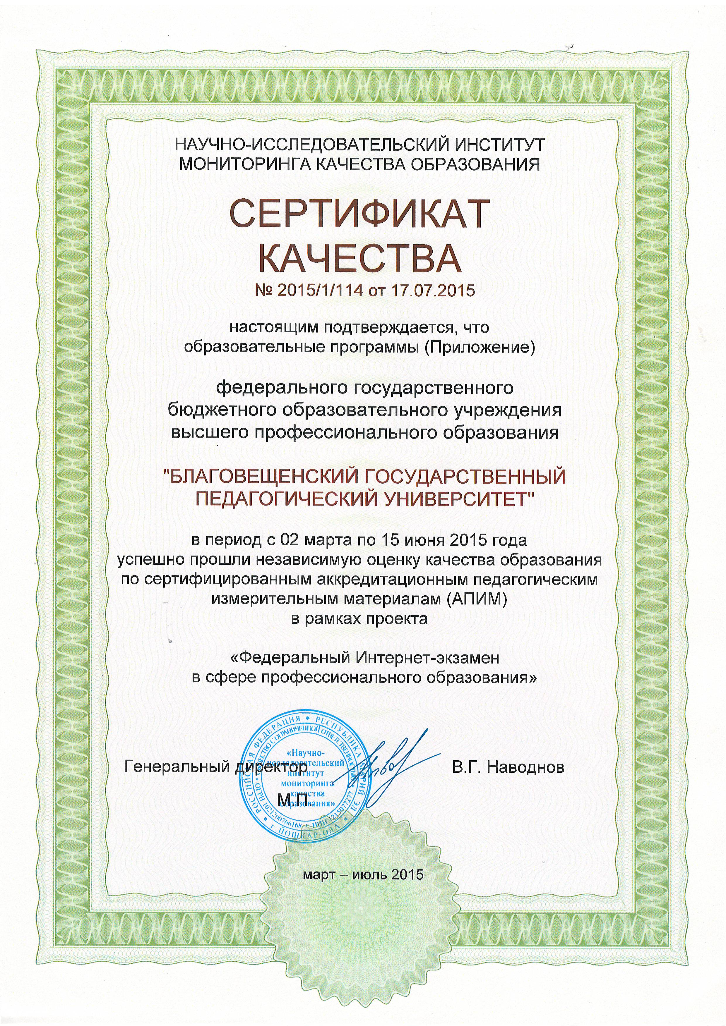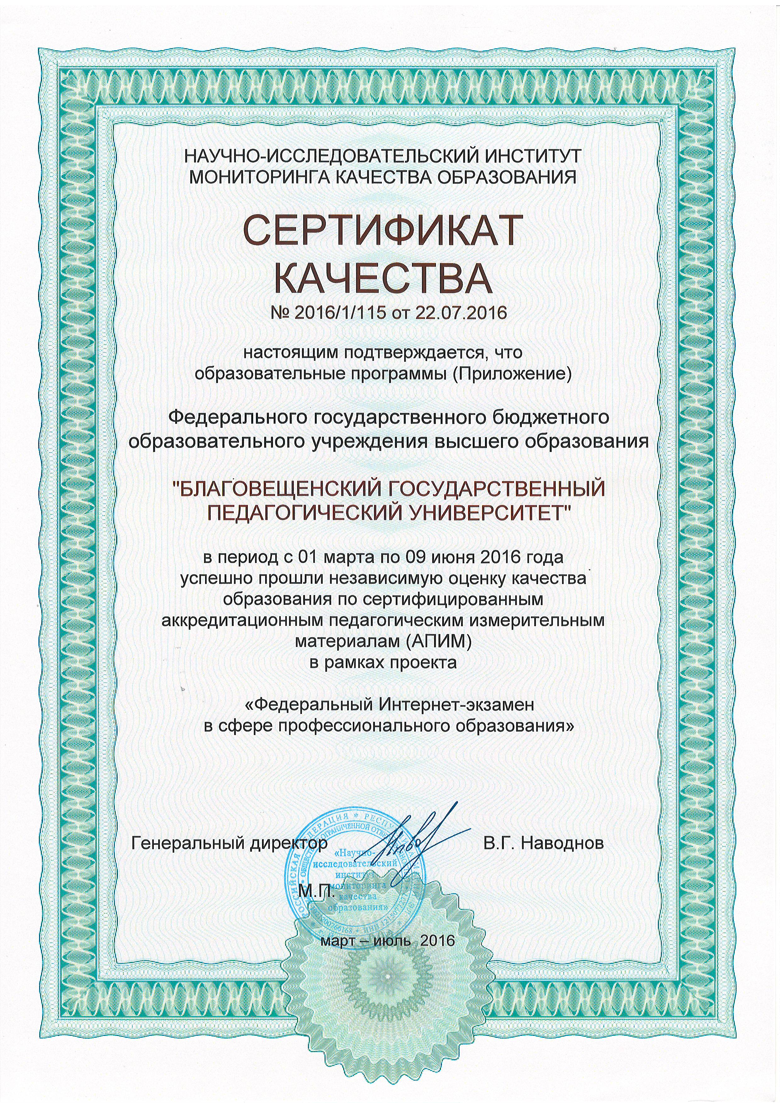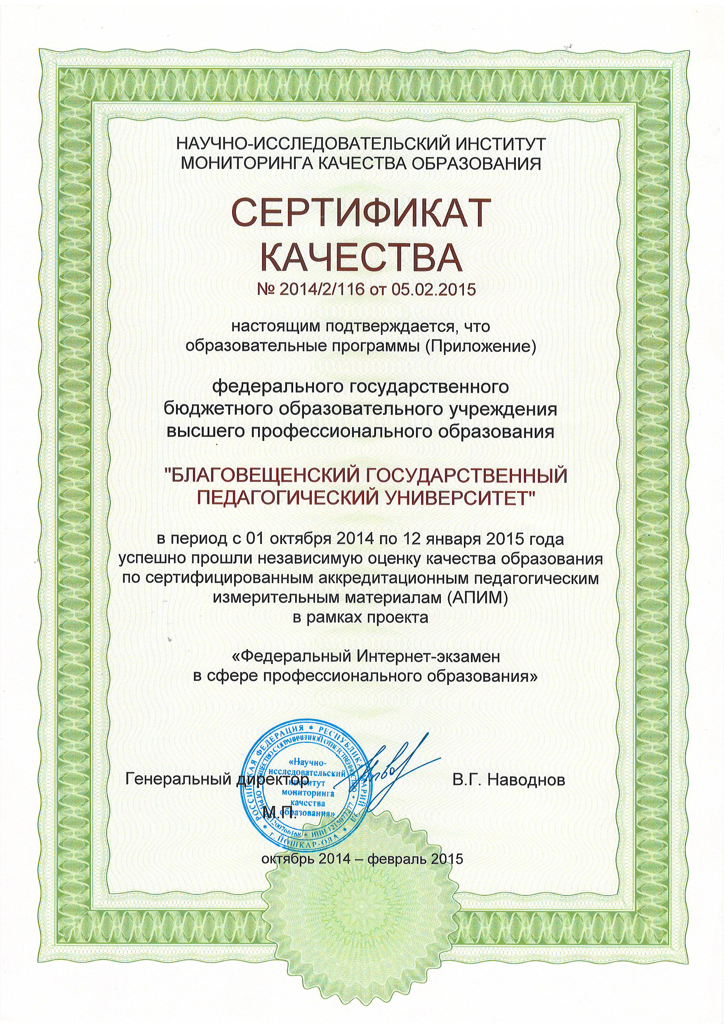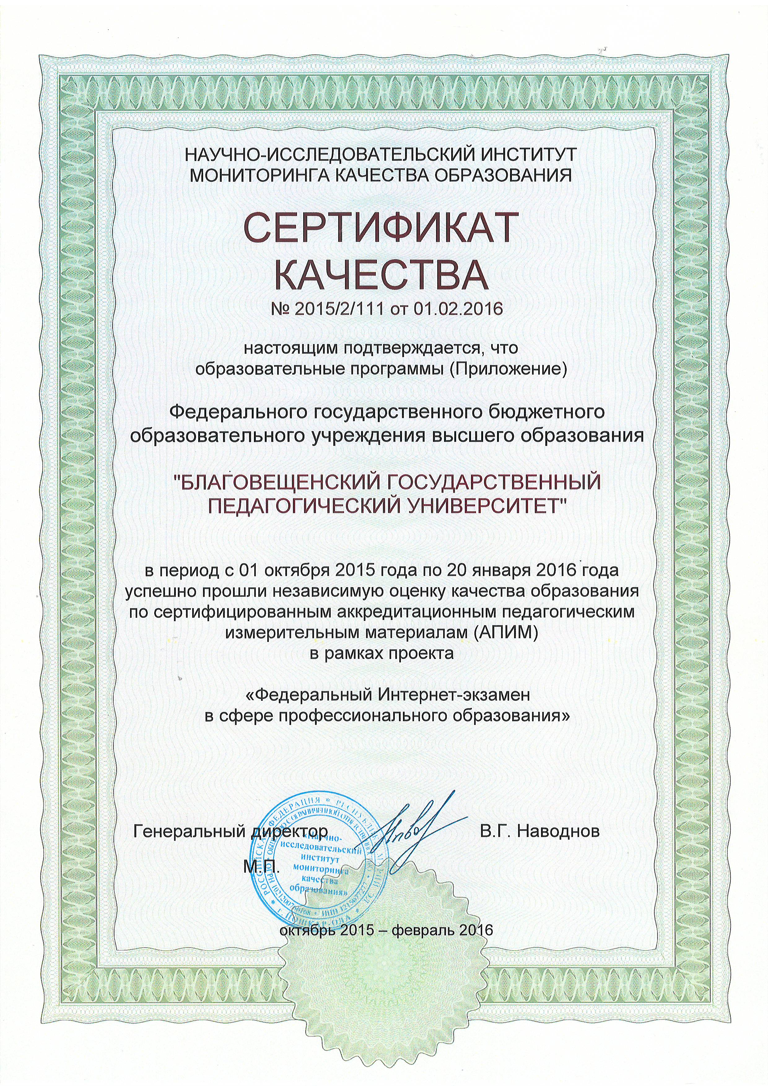 Центр качества образованияФЭПОПроект "Федеральный Интернет-экзамен в сфере профессионального образования (ФЭПО)" ориентирован на проведение внешней независимой оценки результатов обучения студентов в рамках требований ФГОС. БГПУ участвует в ФЭПО с 2006г. В ходе участия расширяется количество специальностей и предметов. Результаты экзаменов в большинстве соответствует требованию ФГОС. «НИИ мониторинга качества образования» в ходе независимой оценки качества образования в БГПУ в рамках участия в ФЭПО выдаются сертификаты качества, которые подтверждают успешные результаты обучения студентов БГПУ. Сертификат качества от 05.02.2015 скачать